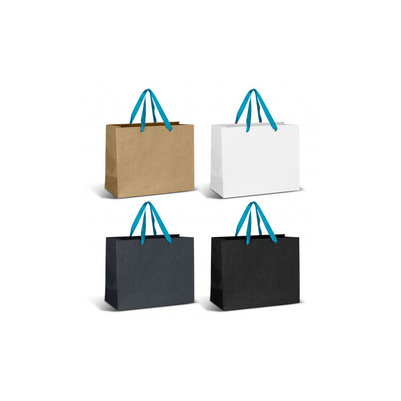 Extra large paper carry bag made from 180gsm FSC-certified materials with a reinforced base and square-folded 100gsm paper handles. This bag is landscape orientated with handles and gusset along the longer edges.