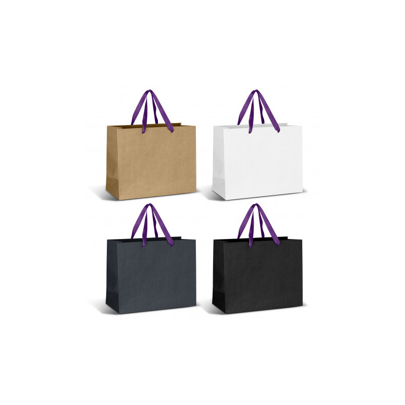 Extra-large carry bag made from 180gsm FSC-certified materials with coloured ribbon handles. The gusset and top edge are reinforced for added strength.