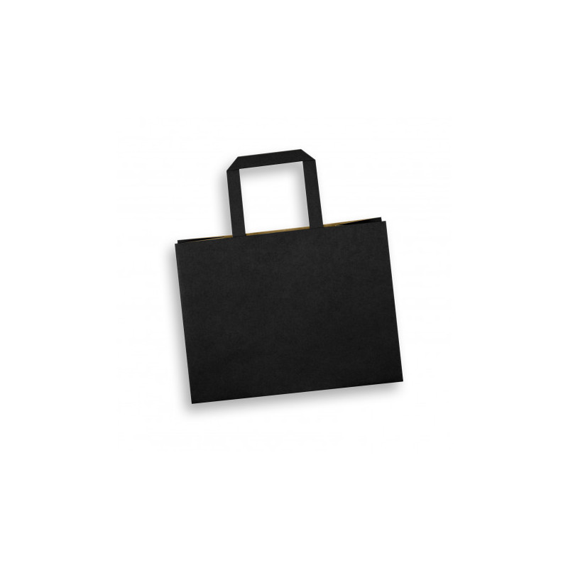 Large paper carry bag made from 180gsm FSC-certified materials with a reinforced base and square-folded 100gsm paper handles. This bag is landscape orientated with handles and gusset along the longer edges.