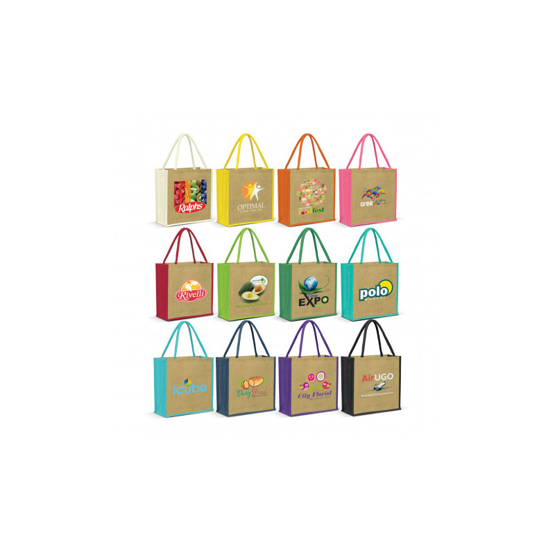 At our company, we offer a range of conference merchandise and products, including the Monza Jute Tote Bag. The minimum order quantities (MOQs) vary depending on the product and how it's decorated—whether printed or otherwise.