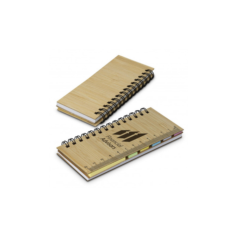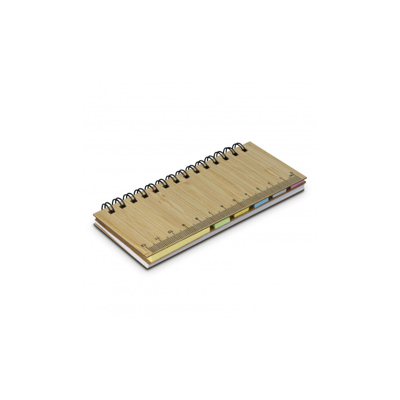 Mini sticky notes book with bamboo veneer cover. Contains 5 blocks of coloured noteflags (25 leaves), 1 block of yellow notes 75 x 50mm (25 leaves) and 1 block of yellow notes 98 x 75mm (50 leaves). Eco Credentials. Renewable, Sustainable, Printed using reusable energy.