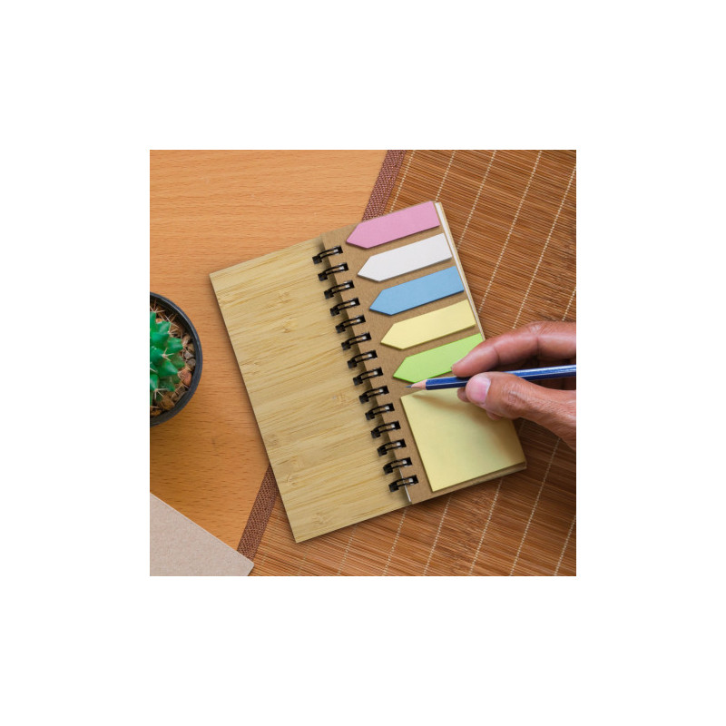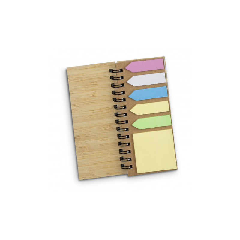 A compact note pad book with bamboo cover, it contains 2 sizes of note pad and 5 sticky flags in 5 neon colours, and self-adhesive, stick to most surfaces.
