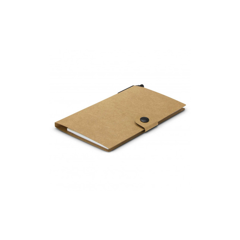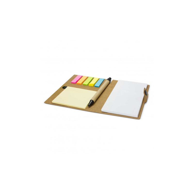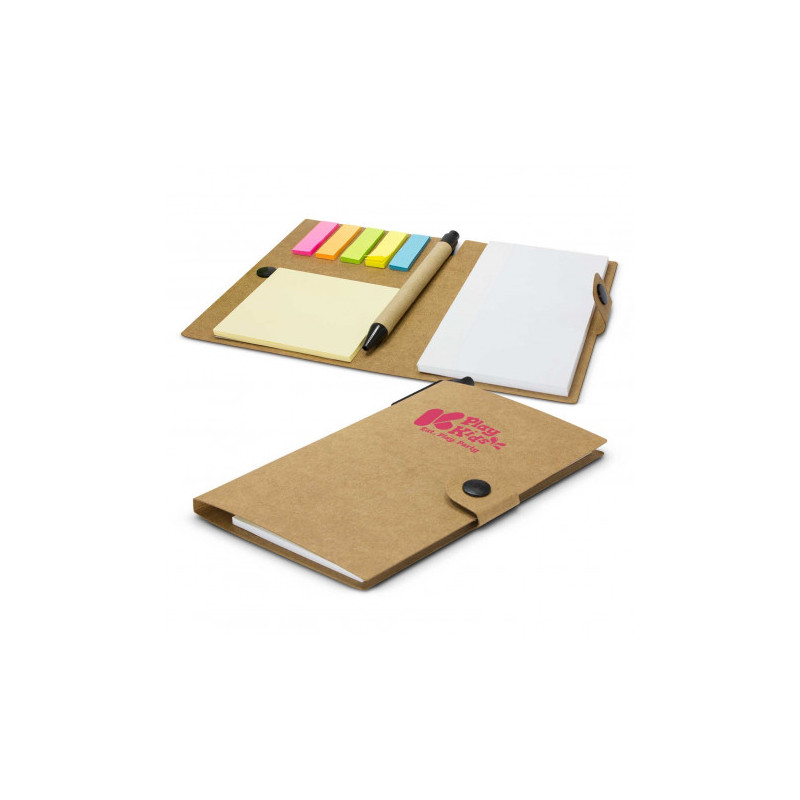A multi-purpose note pad which has a 50 leaf note pad, a 25 leaf pad of adhesive notes, five different coloured pads of adhesive paper flags (blue, pink, orange, yellow, green), and a recycled cardboard barrel pen that slips into the spine of notebook. Unbleached natural cardboard cover with a secure closure. A very handy notebook for office staff and...