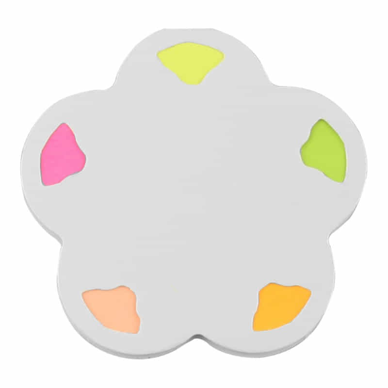 A cardboard bookmark ruler with a round printing area. A block of 25 leaves adhesive note pad (40 mm x 28 mm) and 5 block of 25 leaves of adhesive paper note flags (Blue, Green, Yellow, Pink, Orange).
