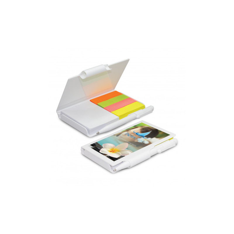 A great Eco-inspired desk top promotional product, it contains 2 sticky note pads, and arrow page marker in 5 colours. The sticky notes and index tabs have bright neon colours and are self-adhesive and stick to most surfaces. It also has a removable ruler and a matching paper barrel pen.
