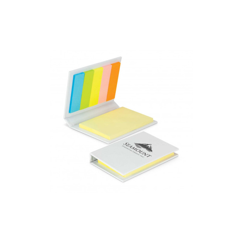Mini notebook with bound cover front and back. Contains 1 repositional notepad and 5 colour assorted neon paper tapeflags.