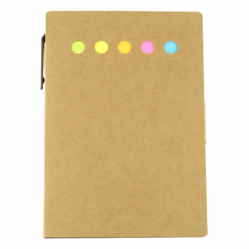 A spiral bound multi-purpose note pad has a 60 leaves(120 pages) lined note pad, a 25 leaves yellow adhesive note pad, five different coloured paper pads of adhesive flags (orange, green, pink, blue, yellow), and a recycled cardboard barrel pen slips into the elastic retaining closure. Unbleached natural cardboard cover. A very handy notebook and note pad...