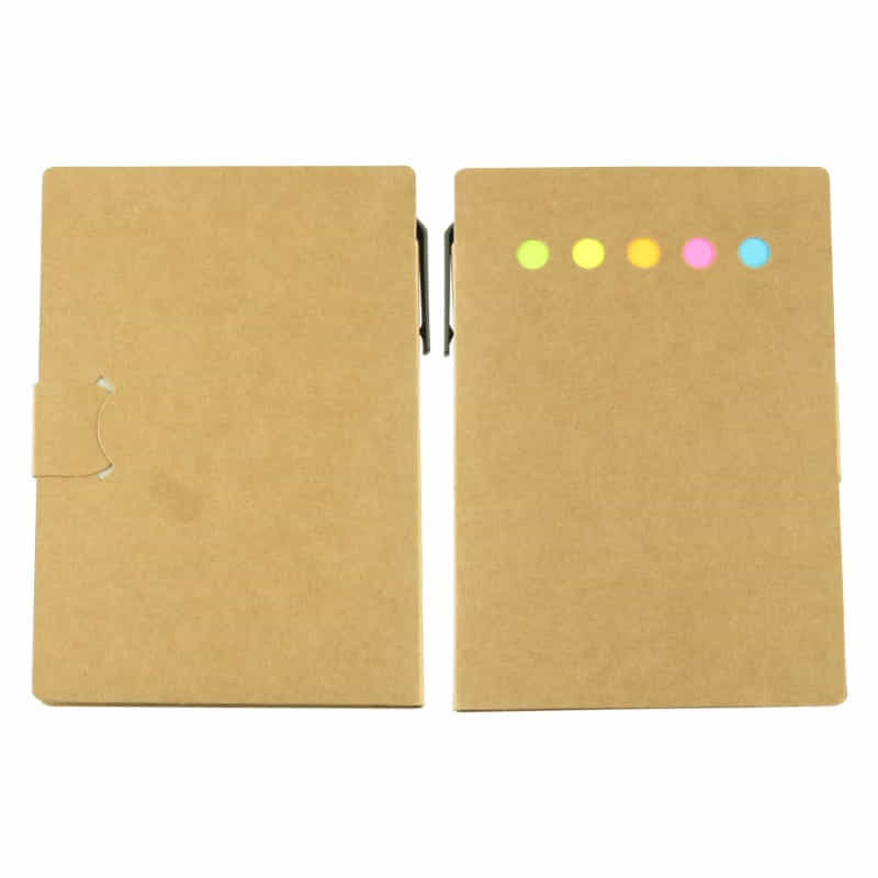 Spiral bound notepad with natural unbleached cardboard cover. 5 different colour notepads (25 leaves) and 5 different colour pads of adhesive notes flags (Blue, Orange, Green, Pink, Yellow). A small and handy note pad, easy to be carried around.