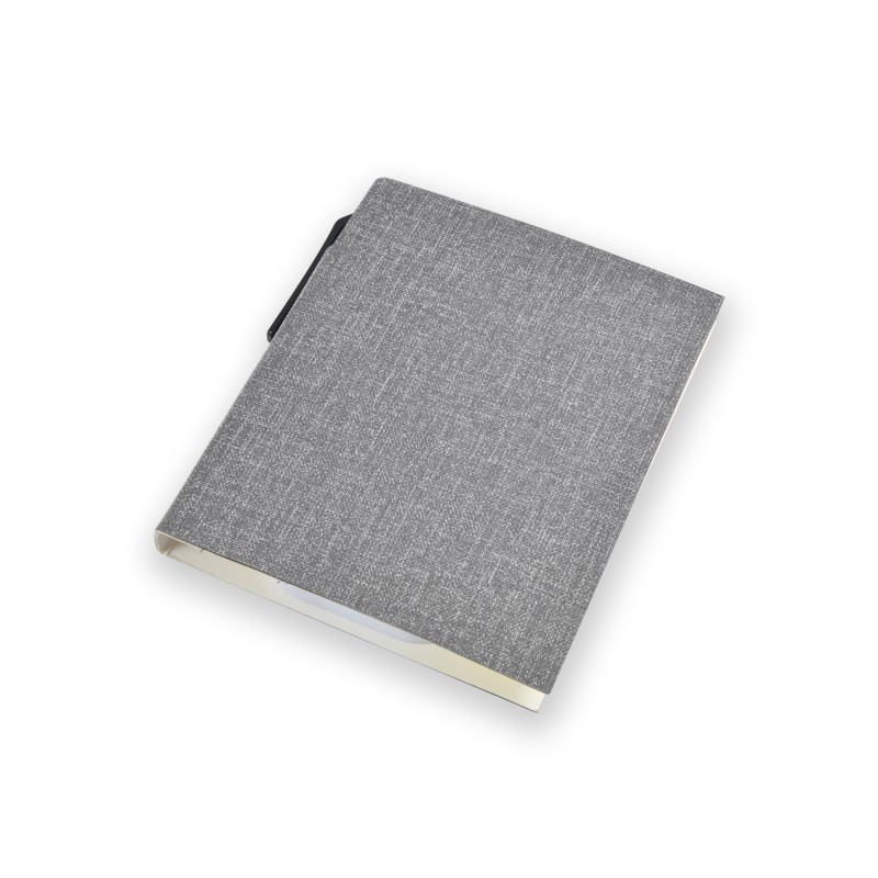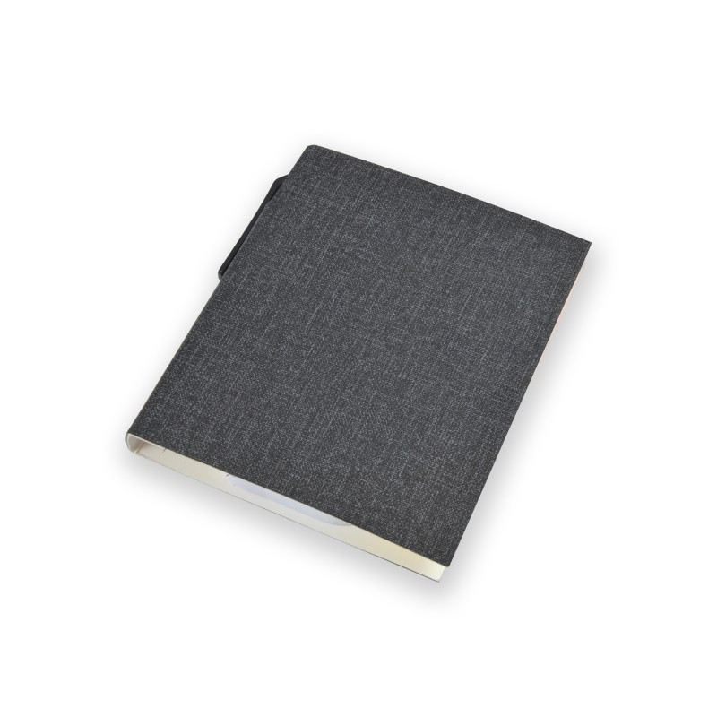 A multi-purpose note pad which has a 50 leaf note pad, a 25 leaf pad of adhesive notes, five different coloured pads of adhesive paper flags (blue, pink, orange, yellow, green), and a recycled cardboard barrel pen that slips into the spine of notebook. Unbleached natural cardboard cover with a secure closure. A very handy notebook for office staff and...