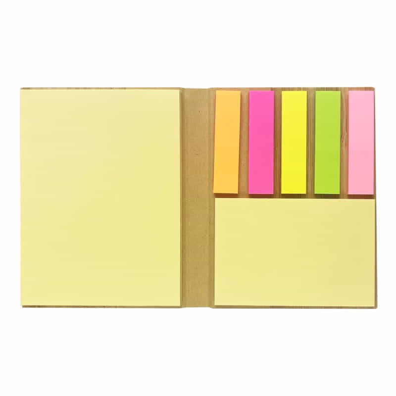 Mini sticky notes book with bamboo veneer cover. Contains 5 blocks of coloured noteflags (25 leaves), 1 block of yellow notes 75 x 50mm (25 leaves) and 1 block of yellow notes 98 x 75mm (50 leaves). Eco Credentials. Renewable, Sustainable, Printed using reusable energy.