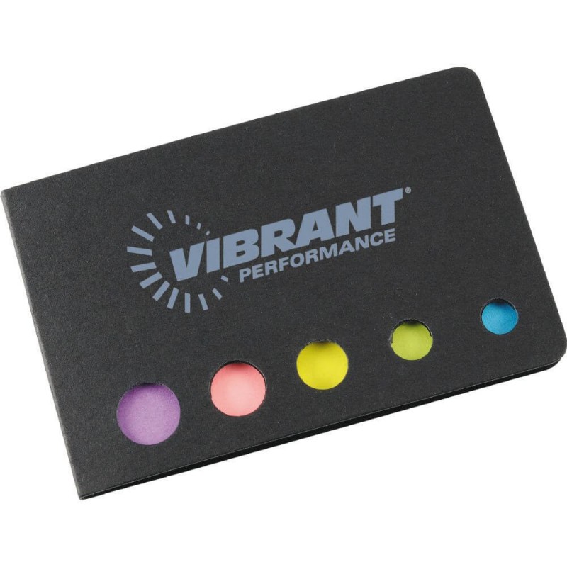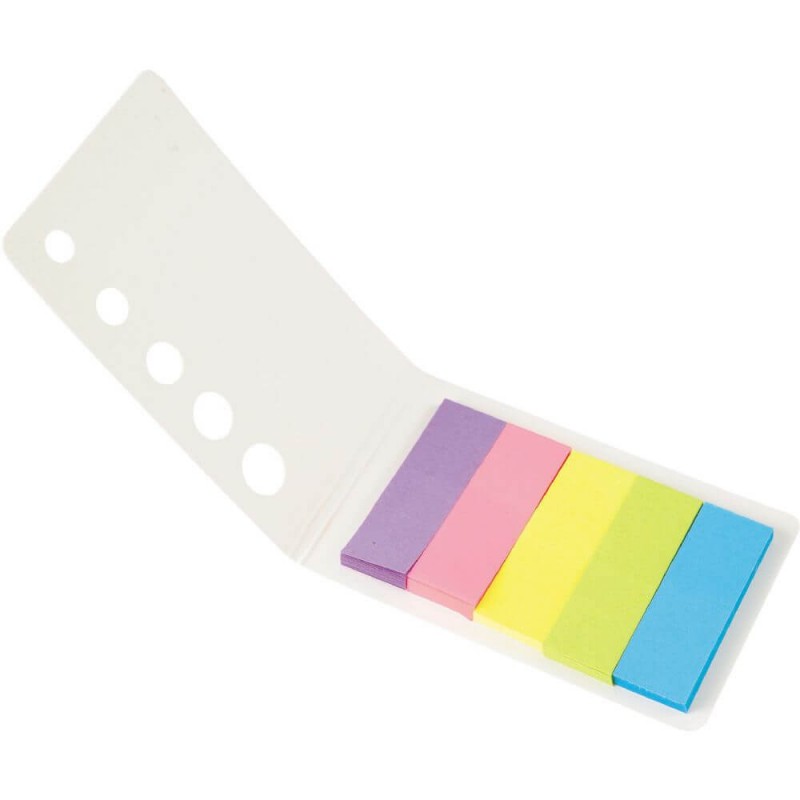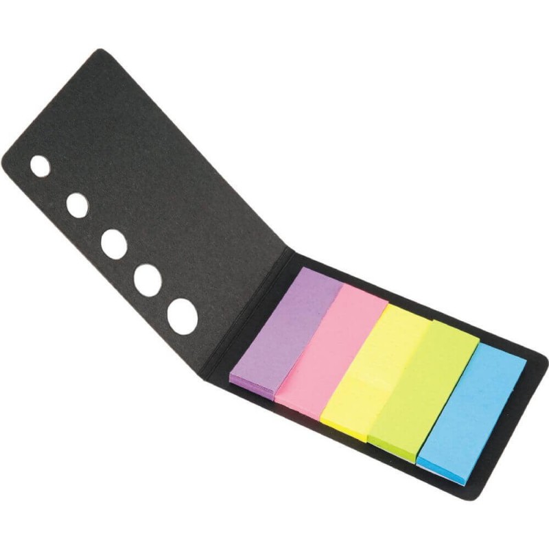 Mini notebook with bound cover front and back. Contains 1 repositional notepad and 5 colour assorted neon paper tapeflags.