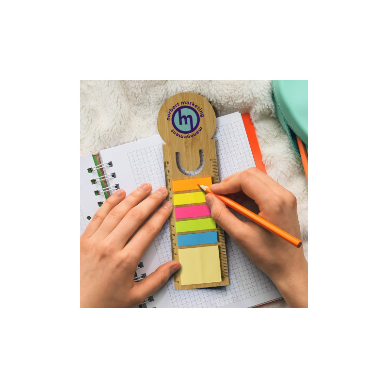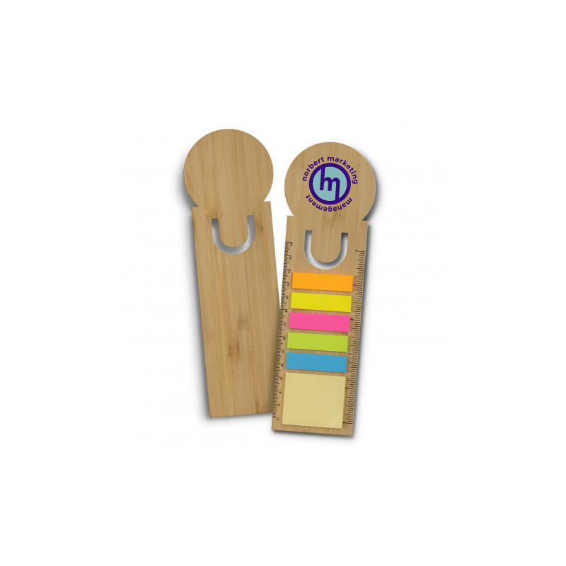 Bamboo ruler bookmark with a pad of yellow adhesive notes and five pads of different coloured adhesive flags. Each pad comes with 25 adhesive leaves. Measurements are printed with black ink in centimetres and inches. Bamboo is a natural material and because the plant is fast growing, it places less demands on natural resources and produces a material that...