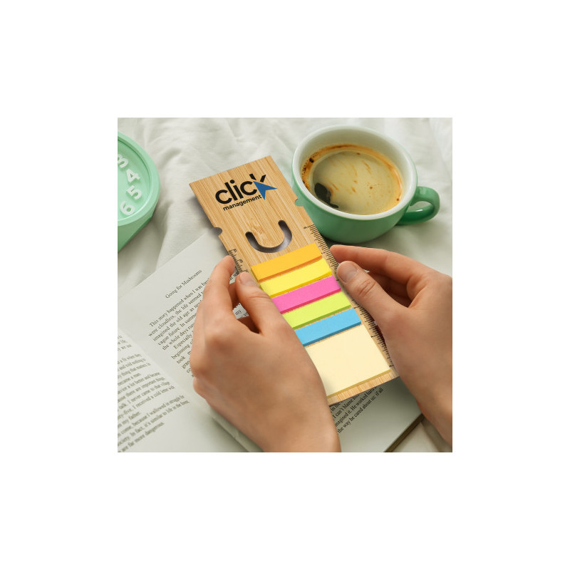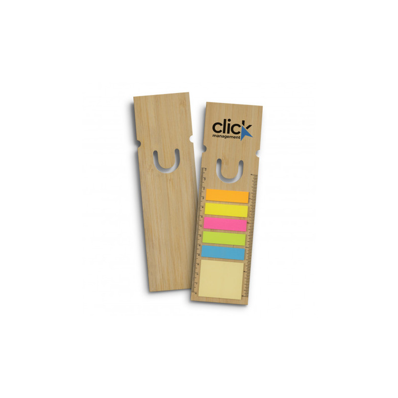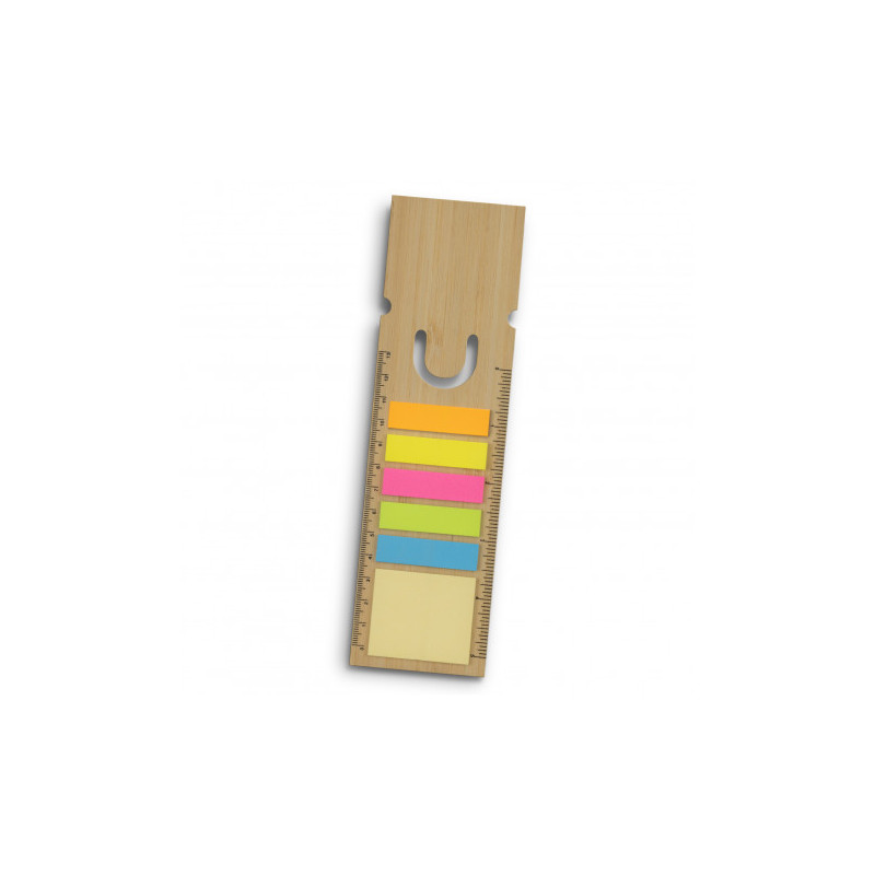 Bamboo ruler bookmark with a pad of yellow adhesive notes and five pads of different coloured adhesive flags. Each pad comes with 25 adhesive leaves. Measurements are printed with black ink in centimetres and inches. Bamboo is a natural material and because the plant is fast growing, it places less demands on natural resources and produces a material that...