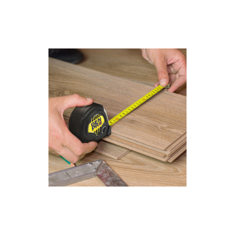 Locking tape measure with a tough outer case and an eight-metre metal tape featuring both inches and centimetres. Other features include a belt clip and a wrist strap.