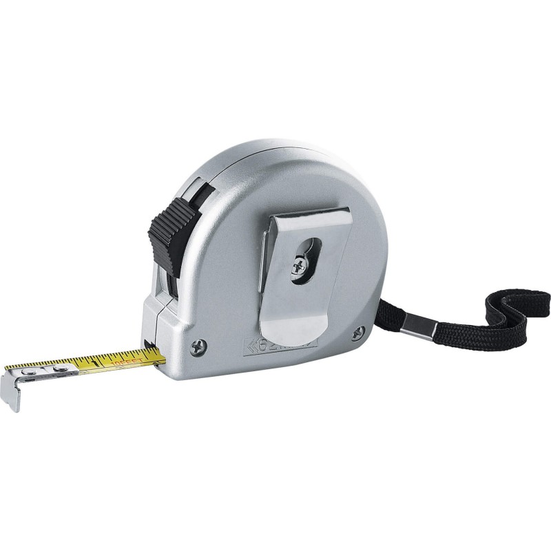 Locking tape measure with a tough outer case and an eight-metre metal tape featuring both inches and centimetres. Other features include a belt clip and a wrist strap.