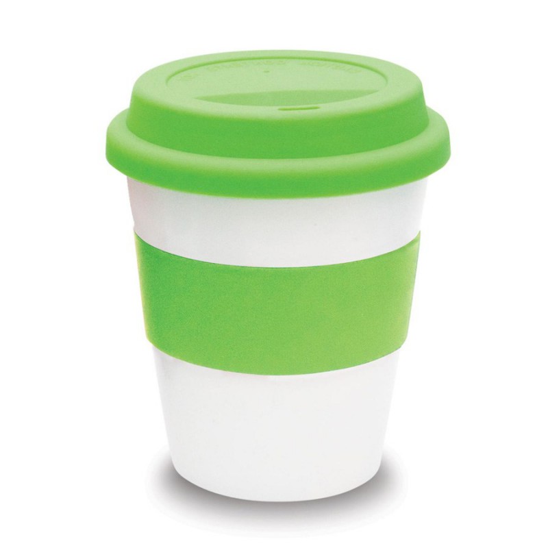 PP reusable takeaway cup. Mix and match silicone bands and silicone lids to your corporate colours. 12 band and lid colours. Alternate hard lid with star closure available.