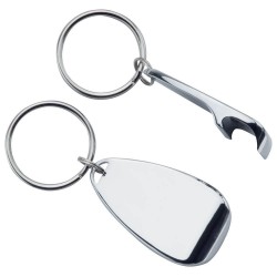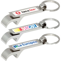 Metal and shiny silver finish. Bottle opener function with large branding option.