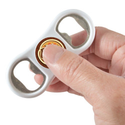 Novelty double-ended plastic and metal bottle opener which can also be used as a stress relieving fidget spinner. It complies with AS/NZS 8124.1.2016 (Safety of Toys) standard.