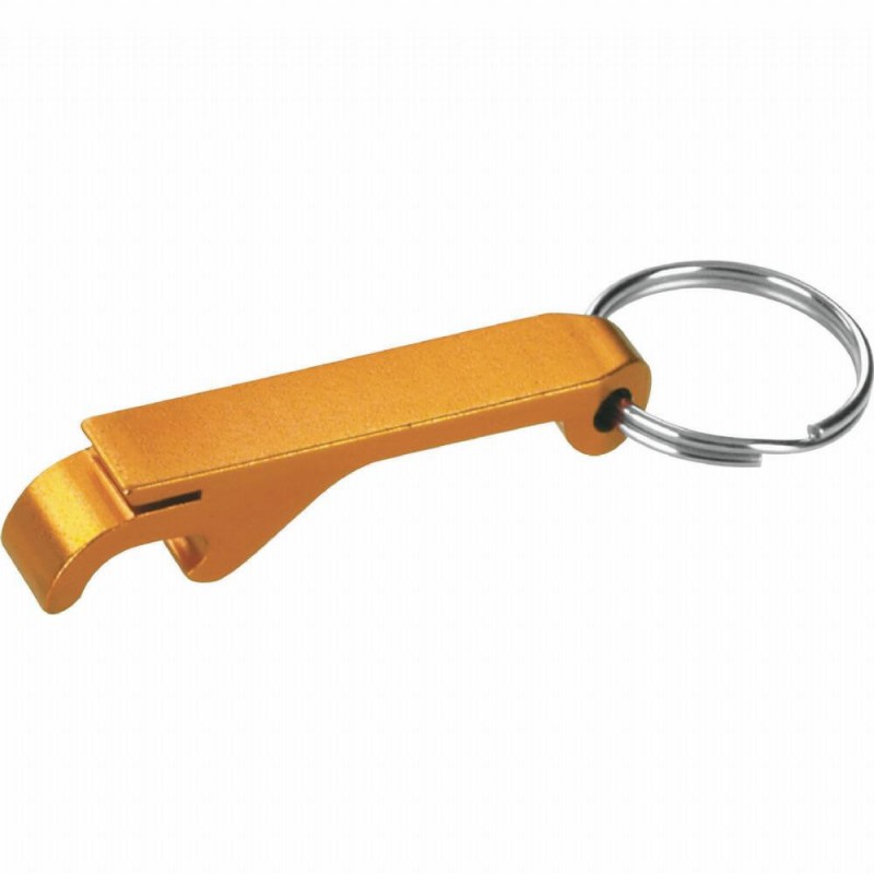 Open bottles and flip-top cans. Metal split key ring. Engraves gold.