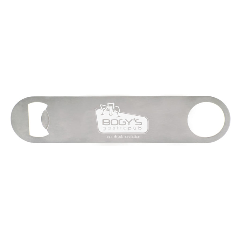 Credit card shaped stainless steel bottle opener with a large branding area.