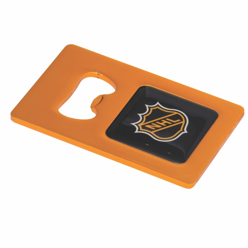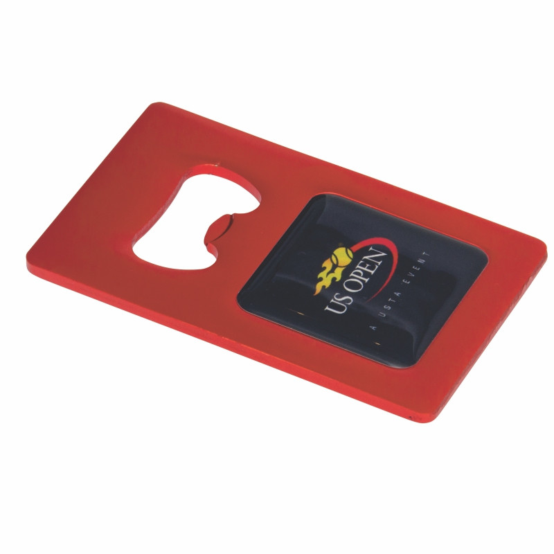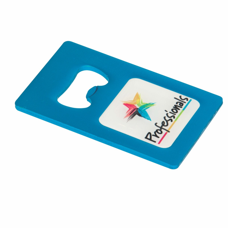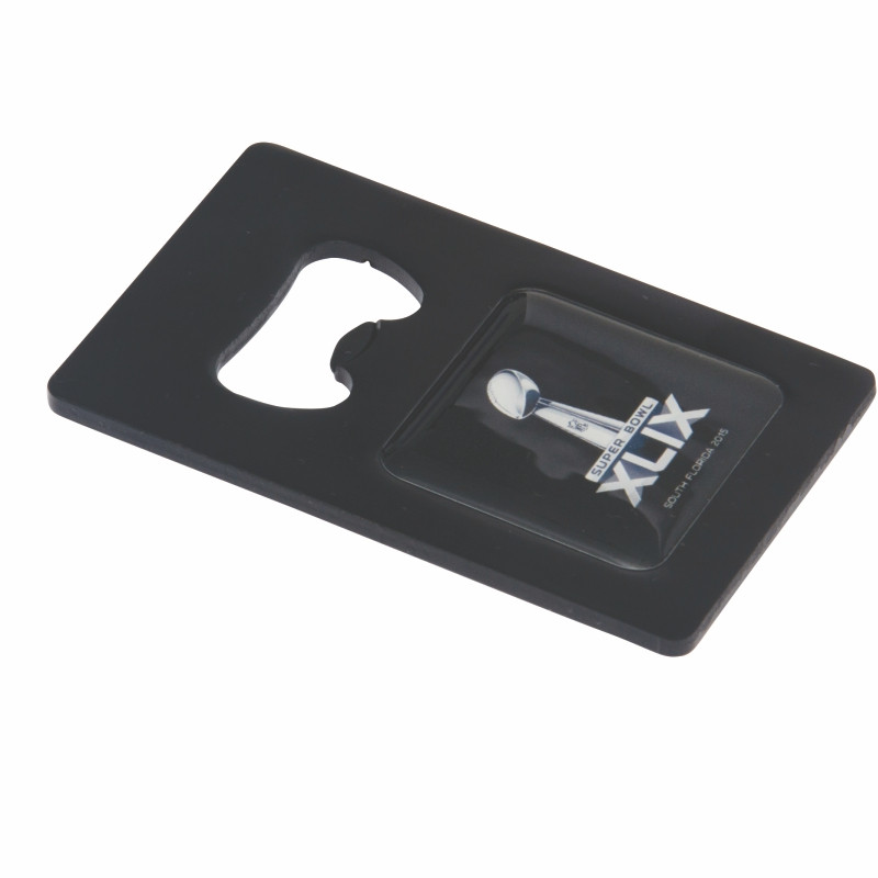 Credit card shaped stainless steel bottle opener with a large branding area.