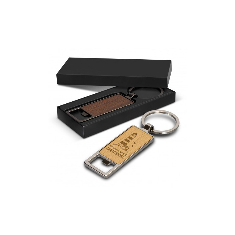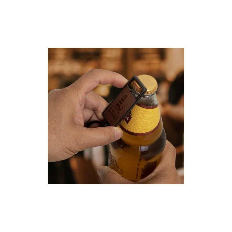 Smart bottle opener with a wooden handle that laser engraves to a natural etch. It also features a silicone loop for easy grip or storage, and a metal part to strengthen the bottle opener. Wood is a natural material which produces unavoidable variances in the grain pattern, colour and branding.
