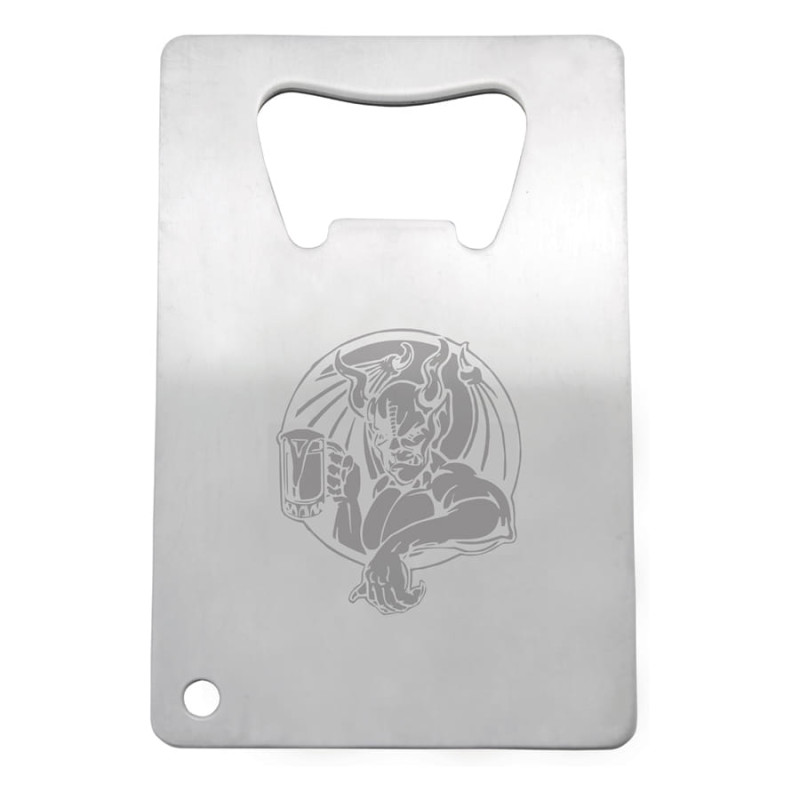 Credit card shaped stainless steel bottle opener with a large branding area.