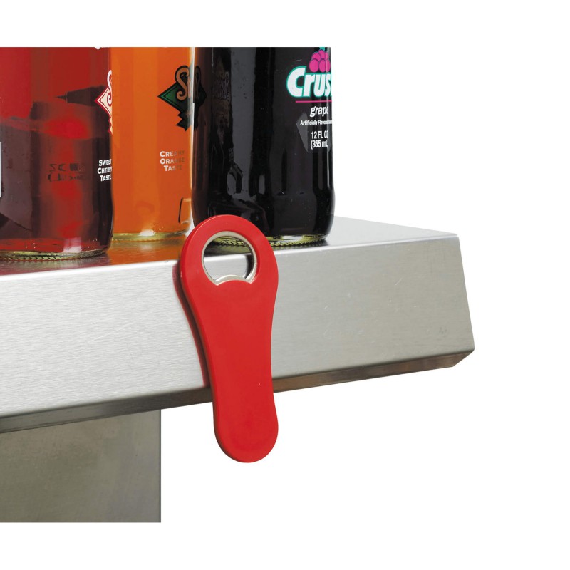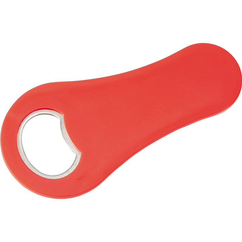 Plastic and metal bottle opener with a magnet for storing it on a fridge.