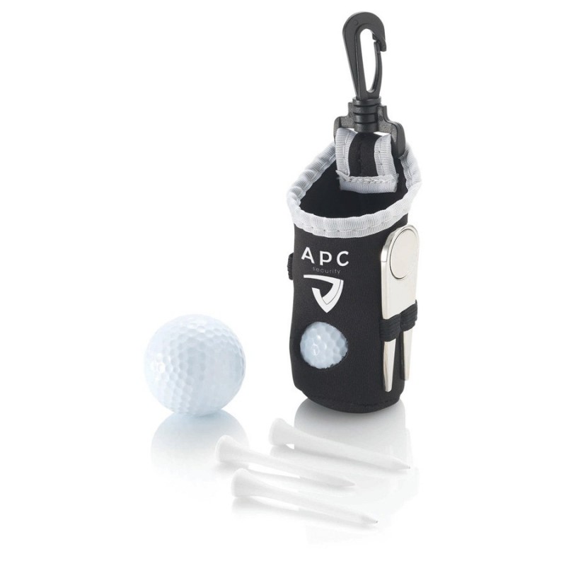 Compact golfer's PU pouch with golfer's multi tool, 3 balls, tees and convenient carry strap and clip.