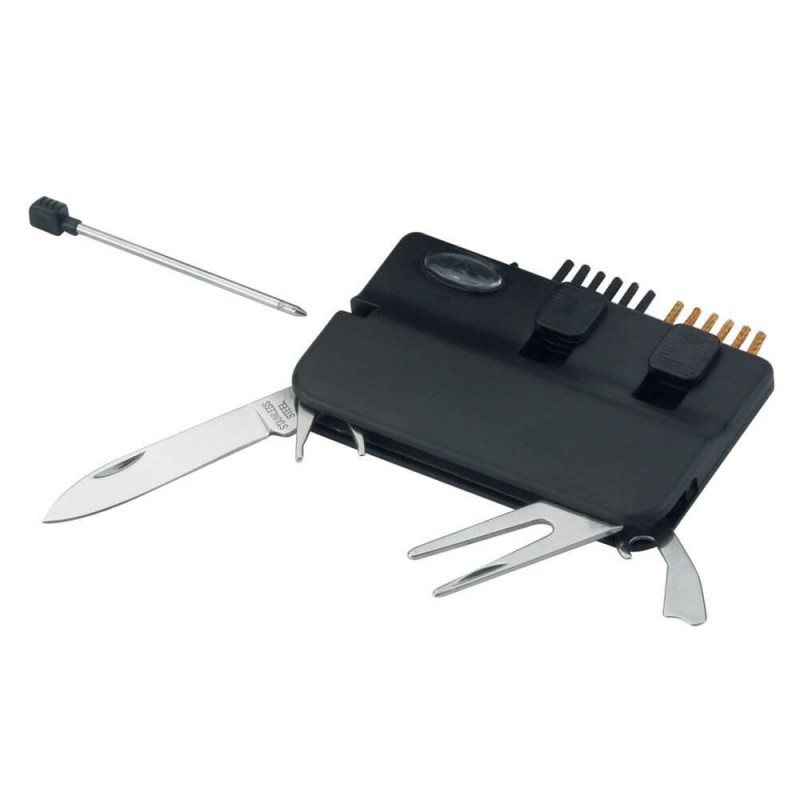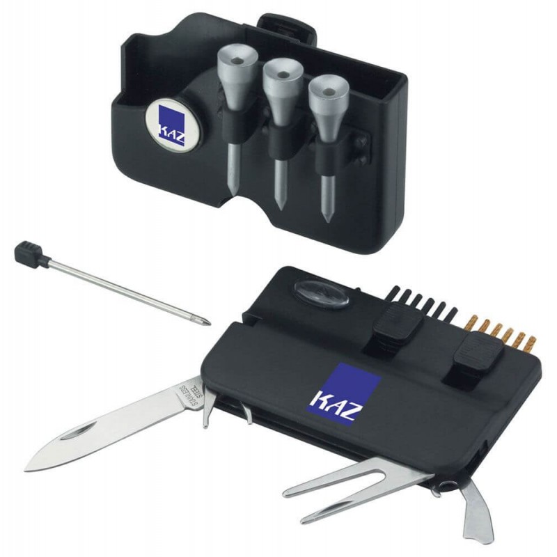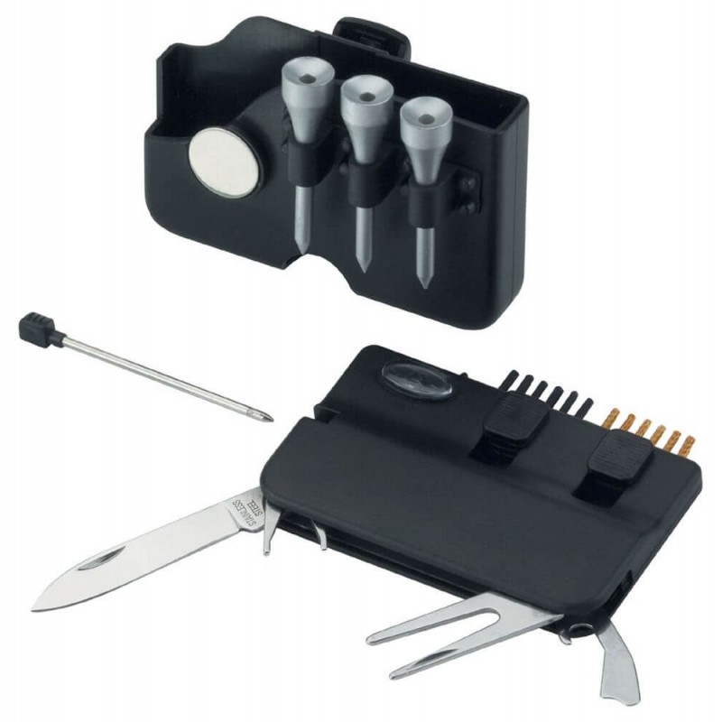 This convenient pouch holds all your tools together. On one side you'll find 3 wooden tees, on the other repair tool with ball marker. Squeeze and a golf ball will pop out the bottom. Two golf balls included.