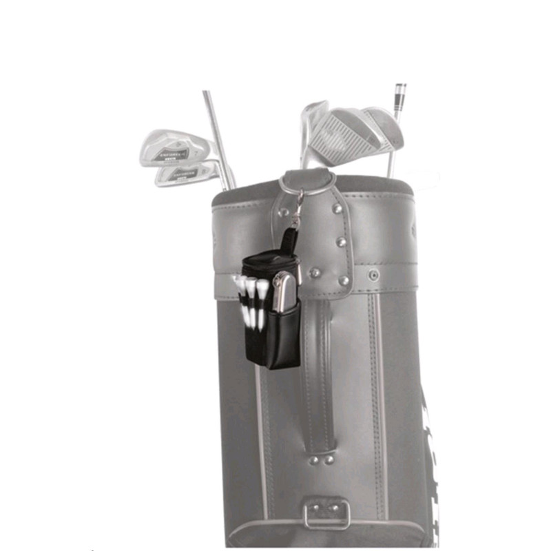 Compact golfer's PU pouch with golfer's multi tool, 3 balls, tees and convenient carry strap and clip.
