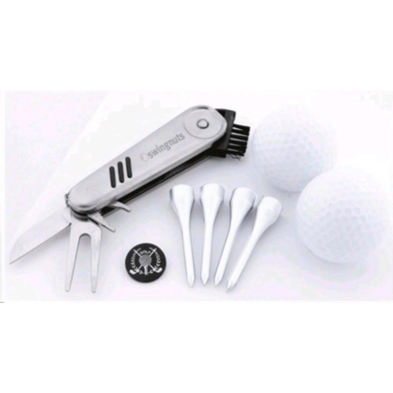 Multi tool with scorer, tees, divot repairer, pen, club & spike, brushes & tools. Belt clip allows you to keep it handy at all times. A great golf day gift.