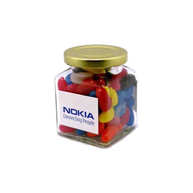 Small Square GlassJar Filled With Mixed Or Corporate Coloured Jelly Beans 100G