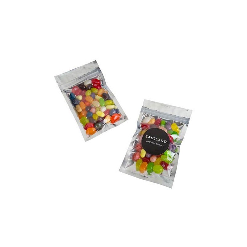 Silver Zip Lock Bag Filled With Jelly Beans 50G ingredient info: On Each Item Packaging: Confectionery Placed Directly into Silver Zip Lock Bag