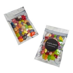 Silver Zip Lock Bag Filled With Jelly Beans 50G ingredient info: On Each Item Packaging: Confectionery Placed Directly into Silver Zip Lock Bag