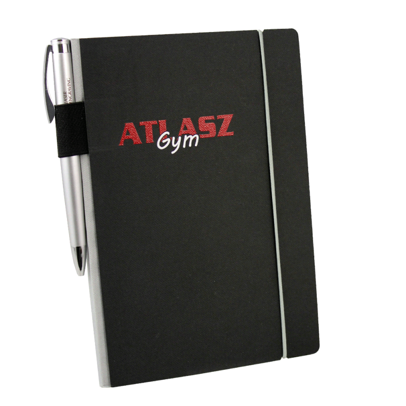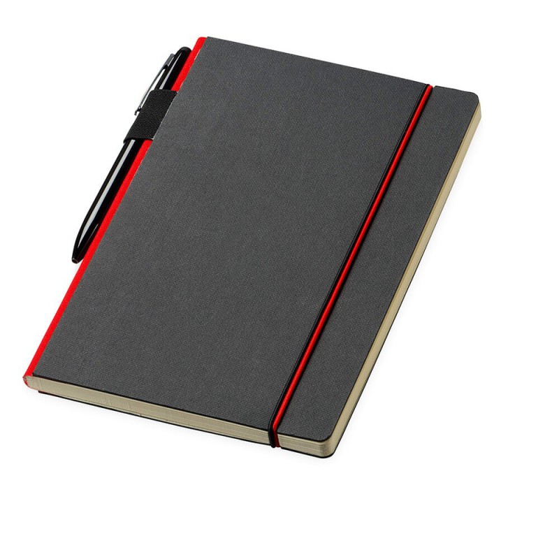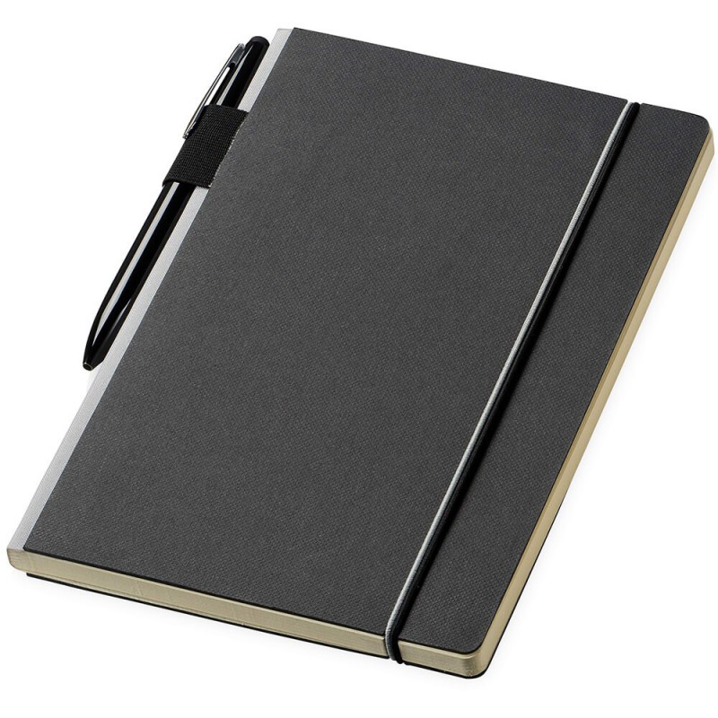 Quality notebook presented in a stylish giftbox. The notebook that has 80 leaves of cream lined 80gsm paper, with a thermo PU cover and an elastic band closure with a branded metal slider.