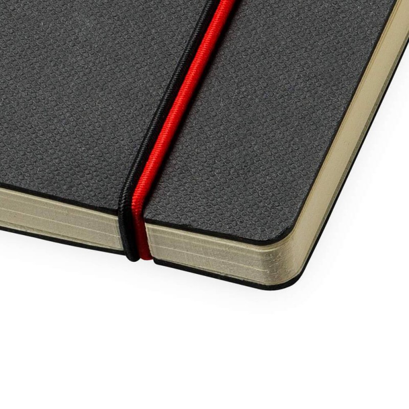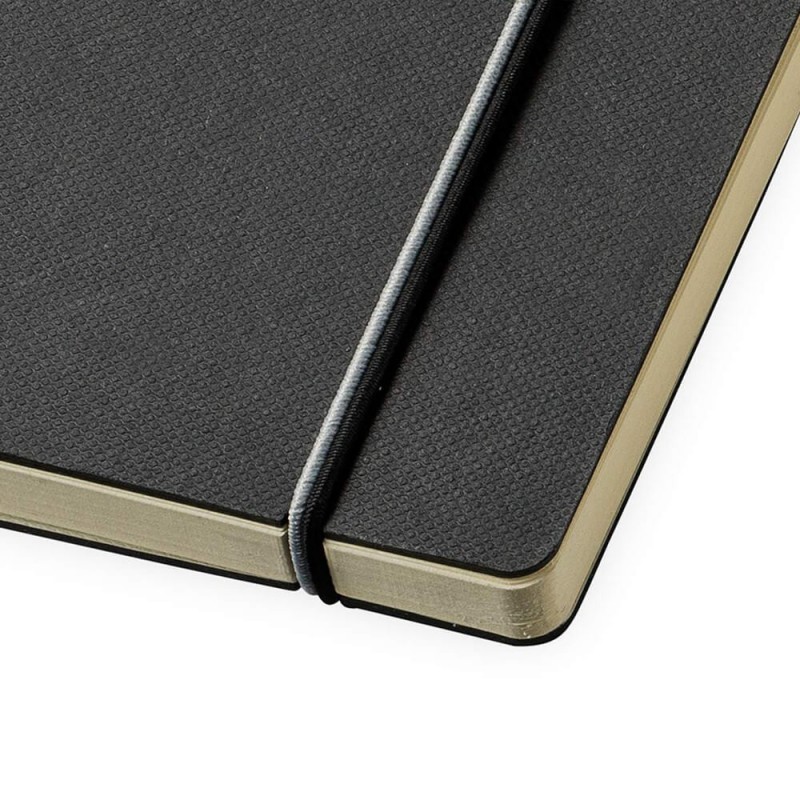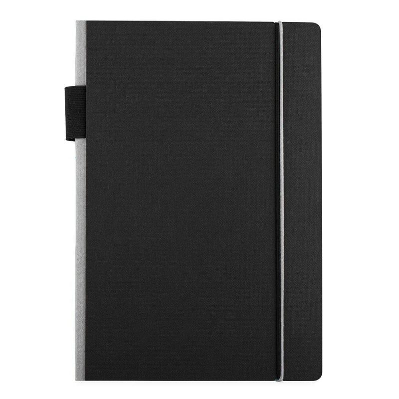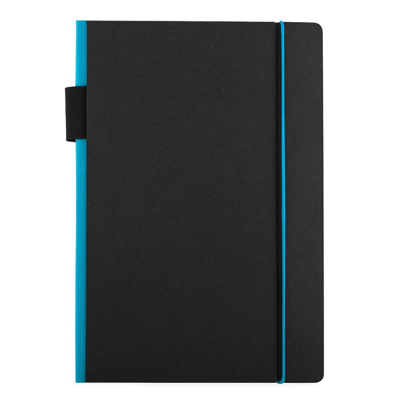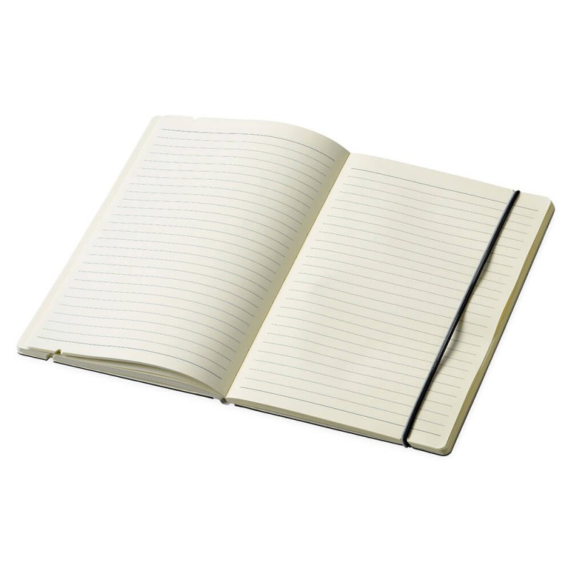 Exceptional A5 notebook with 70 leaves (140 pages) of 80gsm lined cream paper and a bookmark ribbon. It has a hard cover manufactured from recycled post-consumer polyester with an elastic closure and pen loop.