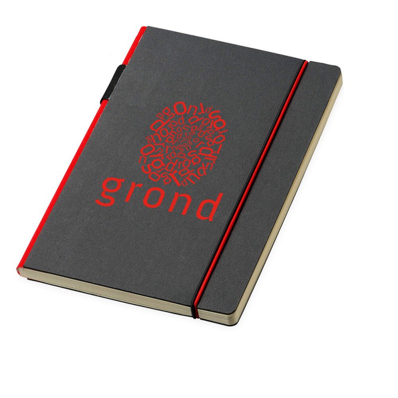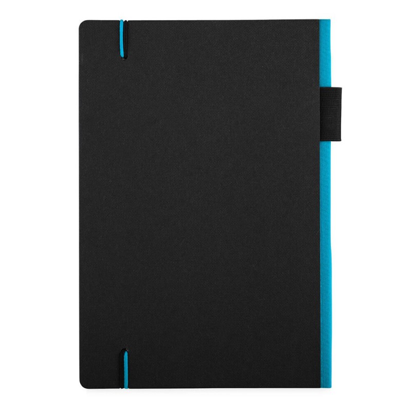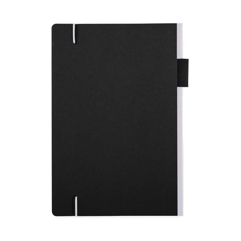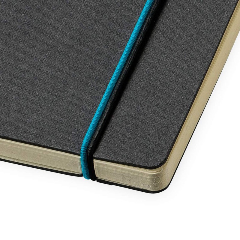 Exceptional A5 notebook with 70 leaves (140 pages) of 80gsm lined cream paper and a bookmark ribbon. It has a soft cover manufactured from recycled post-consumer polyester with an elastic closure.