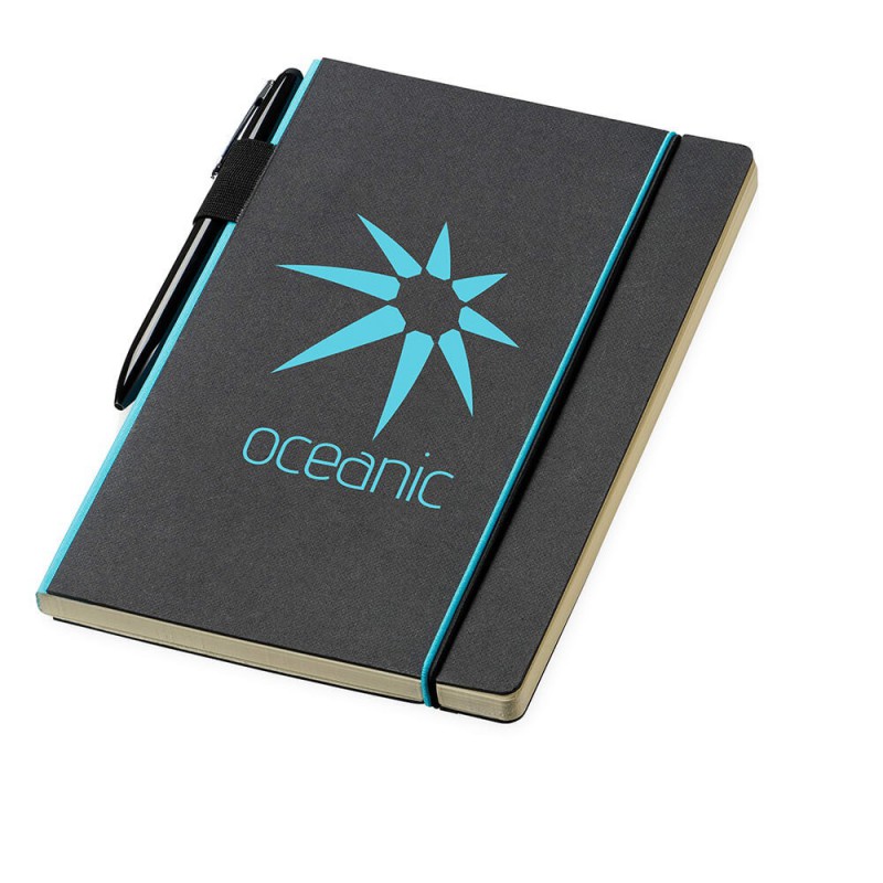 Jotter features recycled cover. Includes matching recycled barrel ballpoint pen. Elastic band closure and pen loop. 60 ruled pages. Pen imprint not available. Pens packed separately.