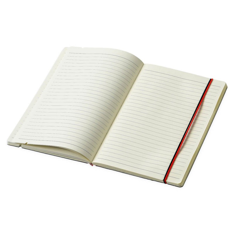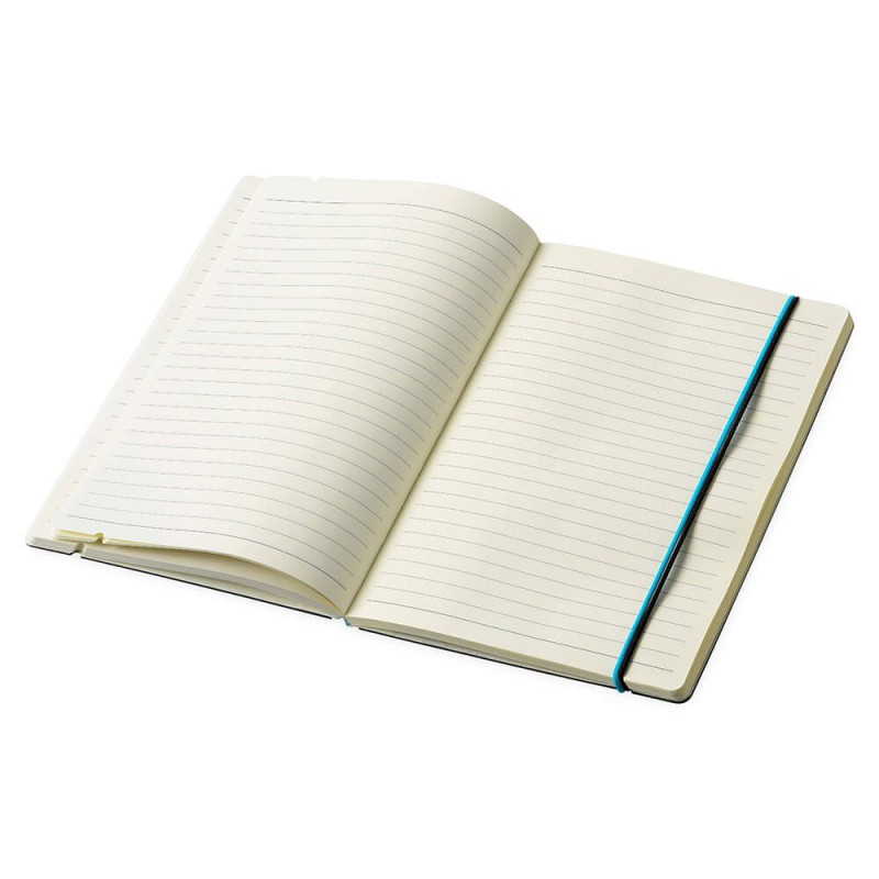 Elastic closure notebook with matching color ribbon bookmark. 80 ruled page notebook.