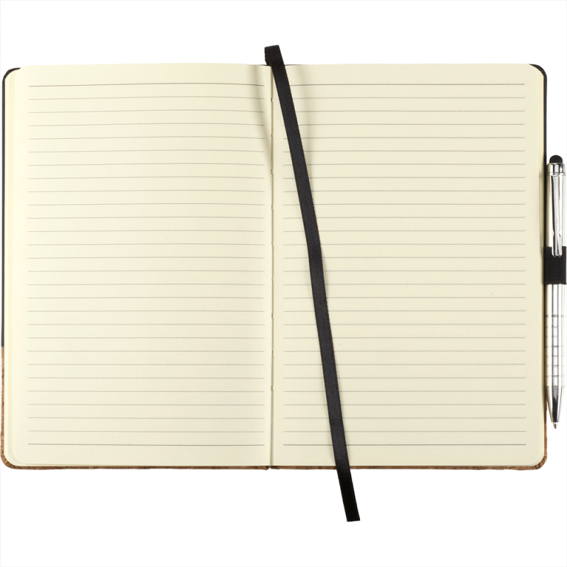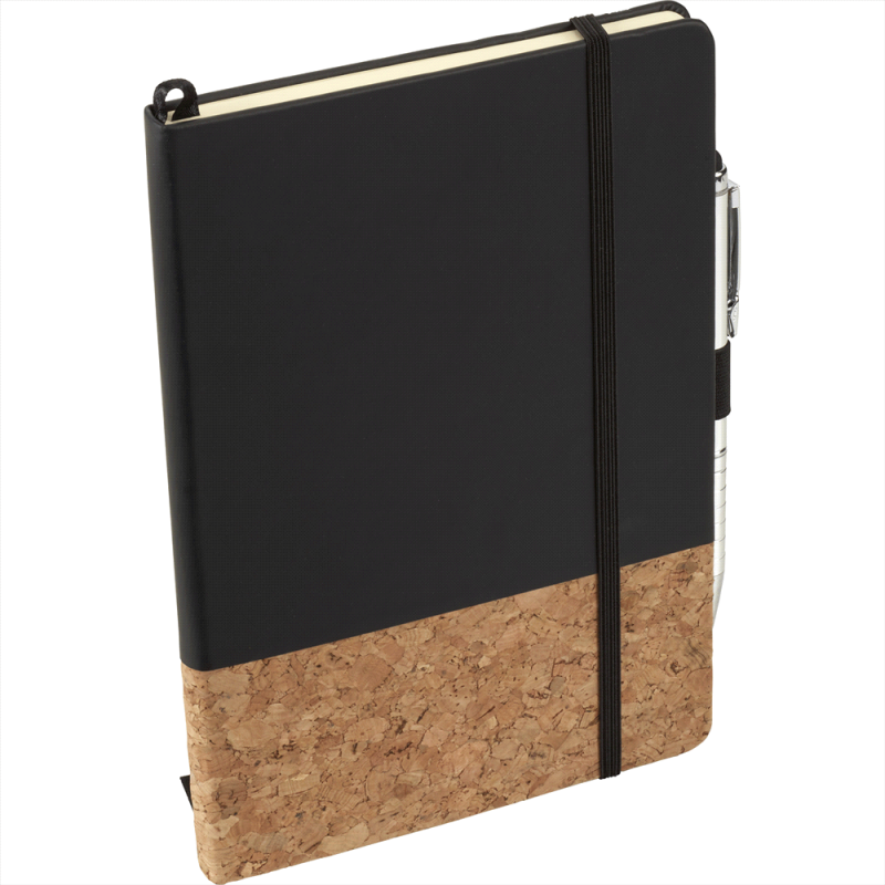 Jotter features recycled cover. Includes matching recycled barrel ballpoint pen. Elastic band closure and pen loop. 60 ruled pages. Pen imprint not available. Pens packed separately.