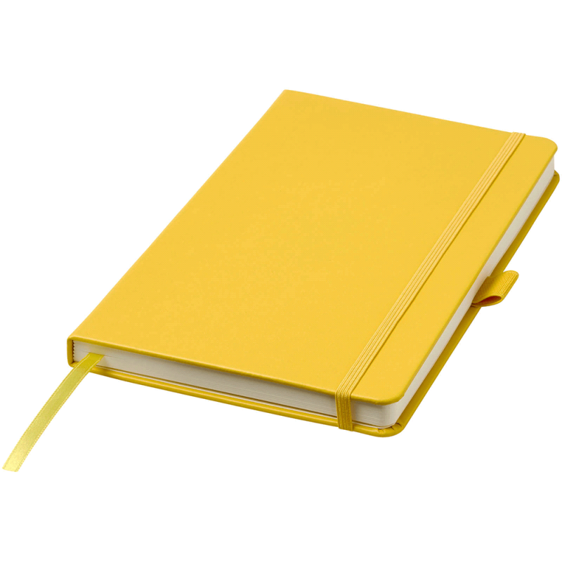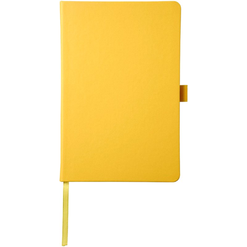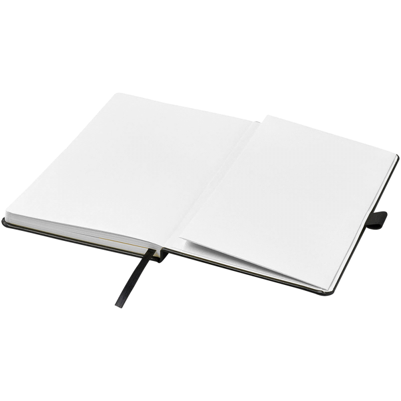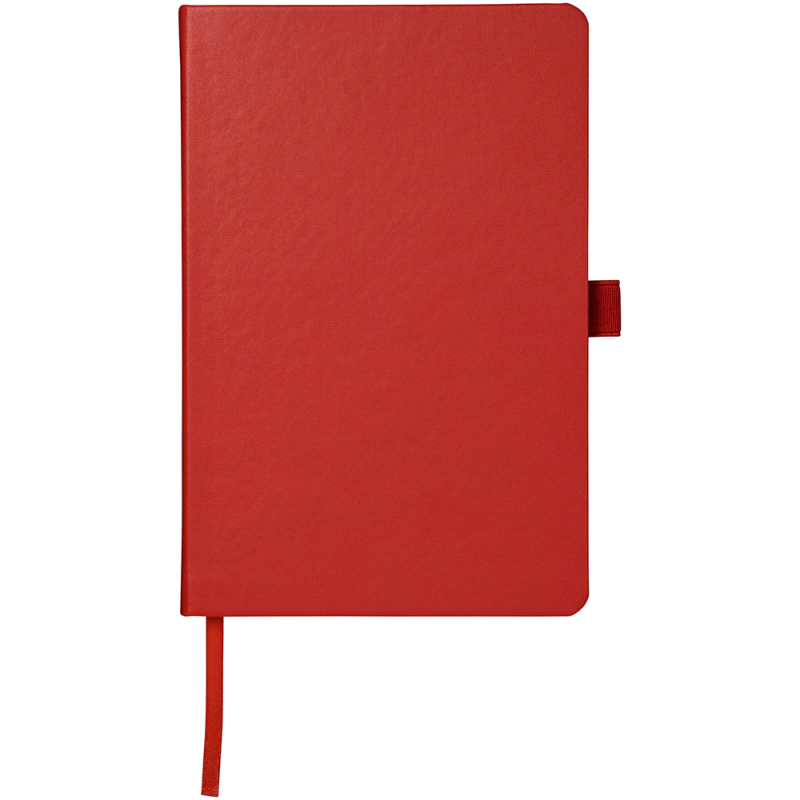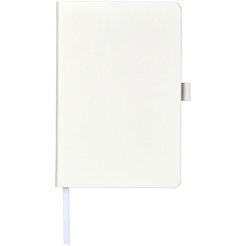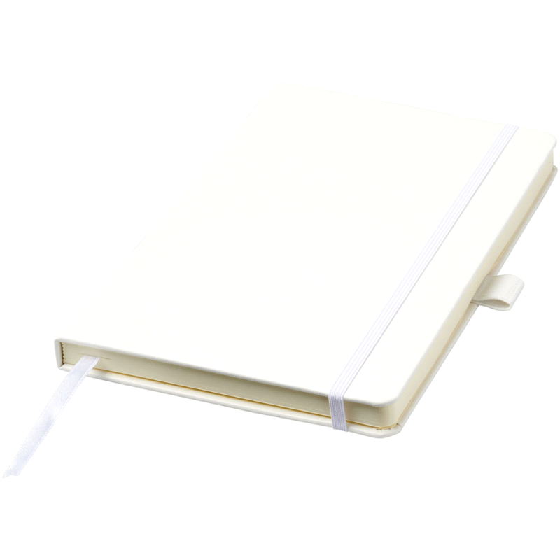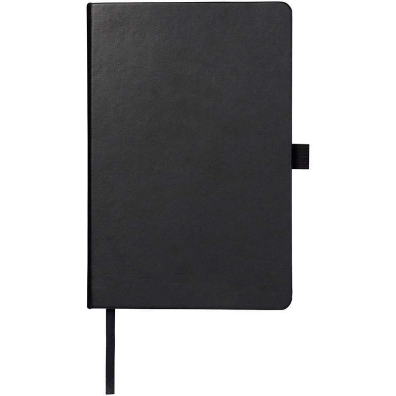 Exceptional A5 notebook with 70 leaves (140 pages) of 80gsm lined cream paper and a bookmark ribbon. It has a hard cover manufactured from recycled post-consumer polyester with an elastic closure and pen loop.