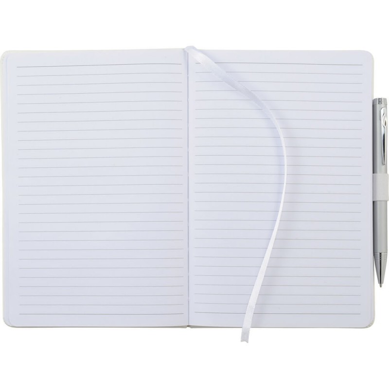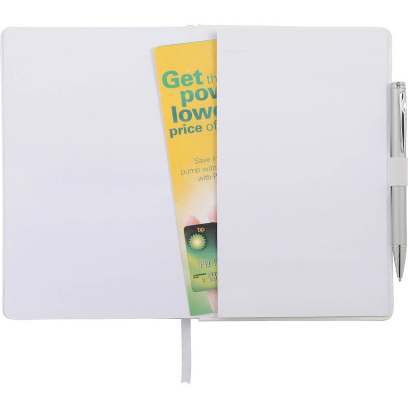 Jotter features recycled cover. Includes matching recycled barrel ballpoint pen. Elastic band closure and pen loop. 60 ruled pages. Pen imprint not available. Pens packed separately.