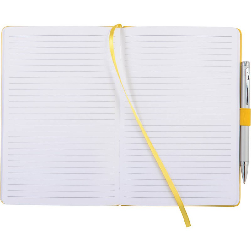 Elastic closure notebook with matching color ribbon bookmark. 80 ruled page notebook.