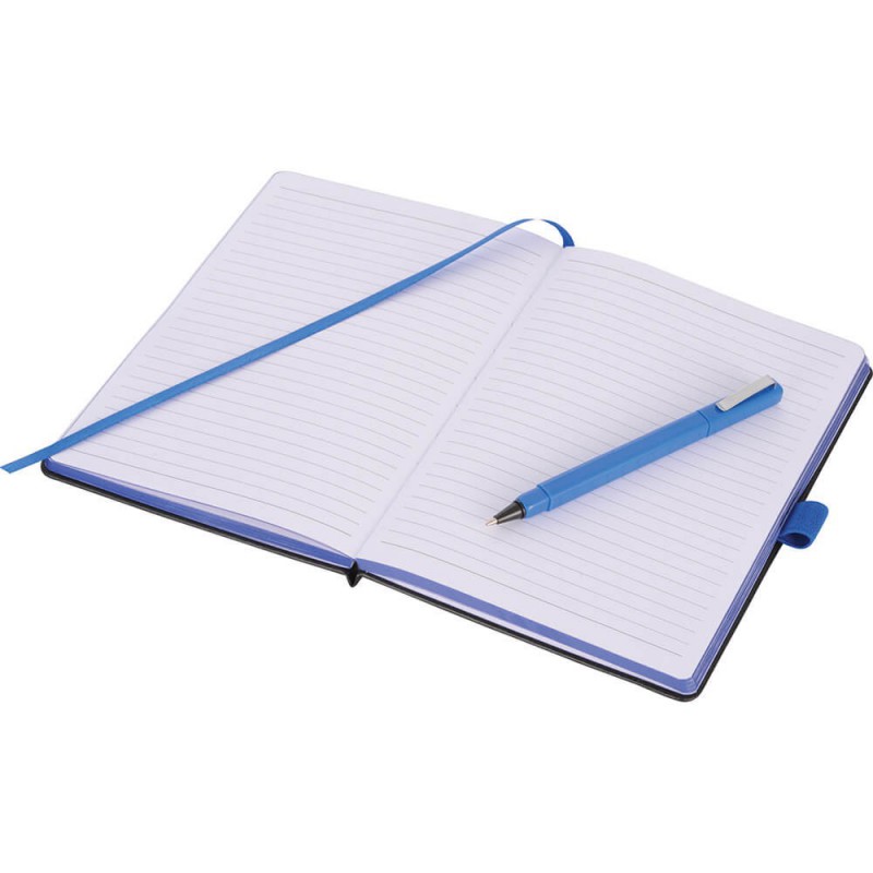 Exceptional A5 notebook with 70 leaves (140 pages) of 80gsm lined cream paper and a bookmark ribbon. It has a soft cover manufactured from recycled post-consumer polyester with an elastic closure.
