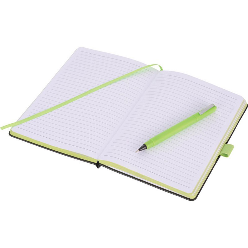 Quality notebook presented in a stylish giftbox. The notebook that has 80 leaves of cream lined 80gsm paper, with a thermo PU cover and an elastic band closure with a branded metal slider.