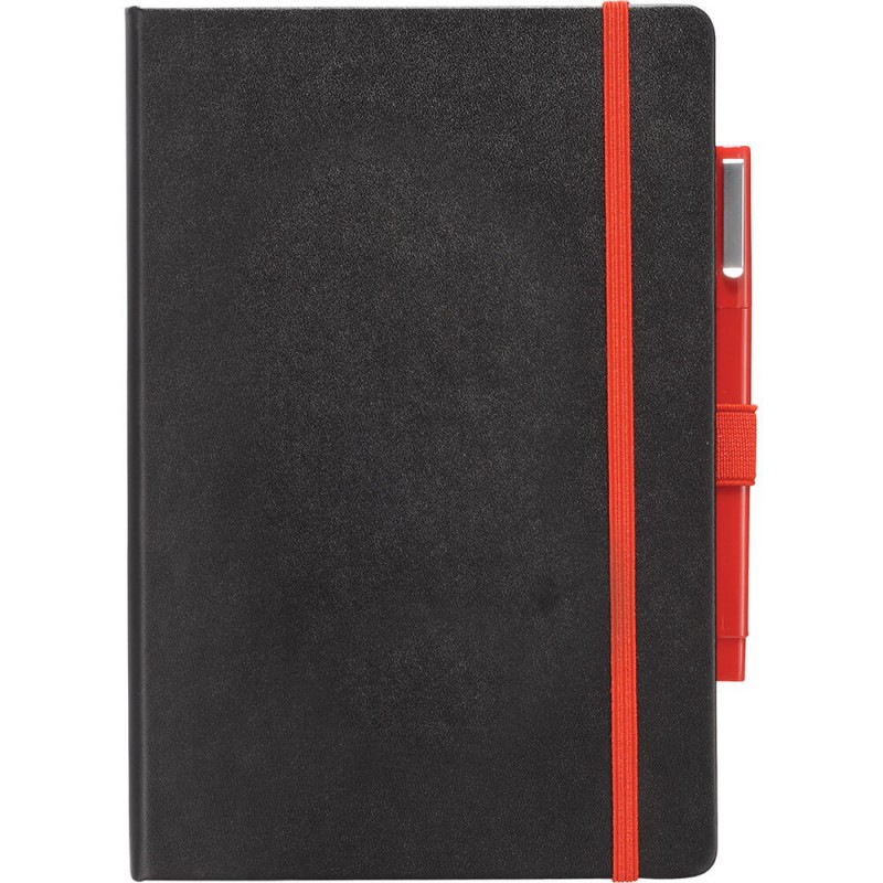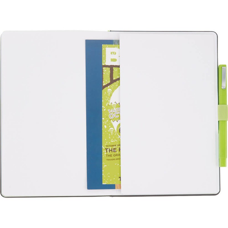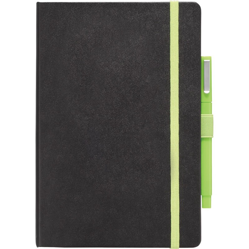 Jotter features recycled cover. Includes matching recycled barrel ballpoint pen. Elastic band closure and pen loop. 60 ruled pages. Pen imprint not available. Pens packed separately.