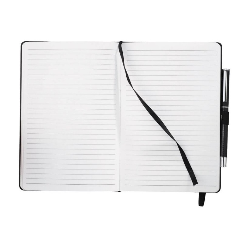 Quality notebook presented in a stylish giftbox. The notebook that has 80 leaves of cream lined 80gsm paper, with a thermo PU cover and an elastic band closure with a branded metal slider.