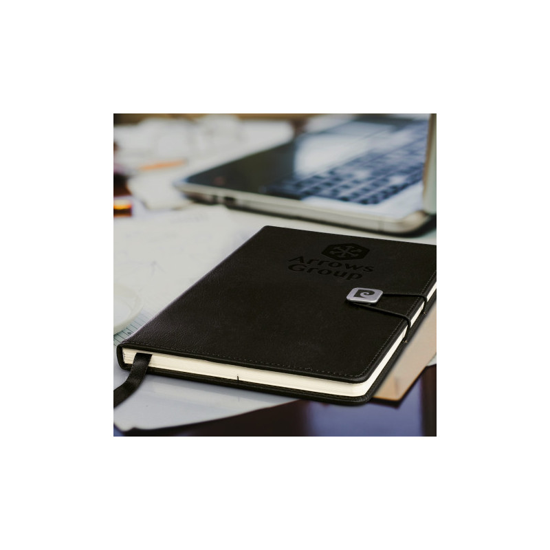 Quality notebook presented in a stylish giftbox. The notebook that has 80 leaves of cream lined 80gsm paper, with a thermo PU cover and a branded metal buckle.