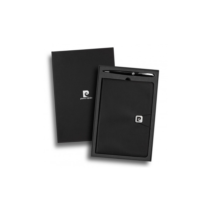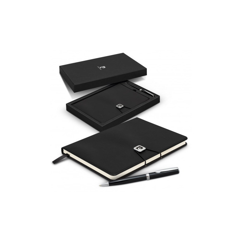 Stylish notebook and pen gift set. The notebook features 80 leaves of cream lined 80gsm paper and has a thermo PU cover with a elastic band closure with a branded metal slider. Accompanying the notebook is a twist-action brass ballpoint pen with shiny chrome trim, and 4000m of black Dokumental ink. The notebook and pen are presented in a Pierre Cardin...